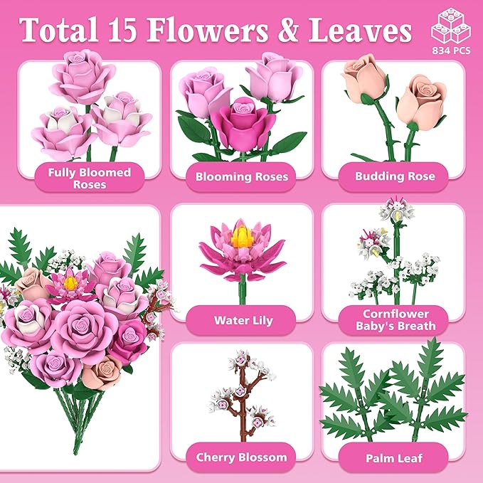 【High Quality & Compatible with Lego Flowers Building Block】: Our flowers bouquet building blocks are made of high-quality and eco-friendly ABS plastic, and the surface of the blocks feels smooth. Precision casting processing molding, give you good overall experience in the assembly process. The blocks is Compatible with Lego Flower, so you can also match it with the other flowers in your home. Ideal gifts for girlfriend, girlfriend gifts