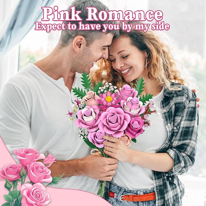 Pink Rose Bouquet Flowers Building Set, 834Pcs Roses Artificial Flowers Botanical Collection Compatible with Lego Flowers for Adults Valentines Day Gifts for Her Women Wife Girlfriend Mom