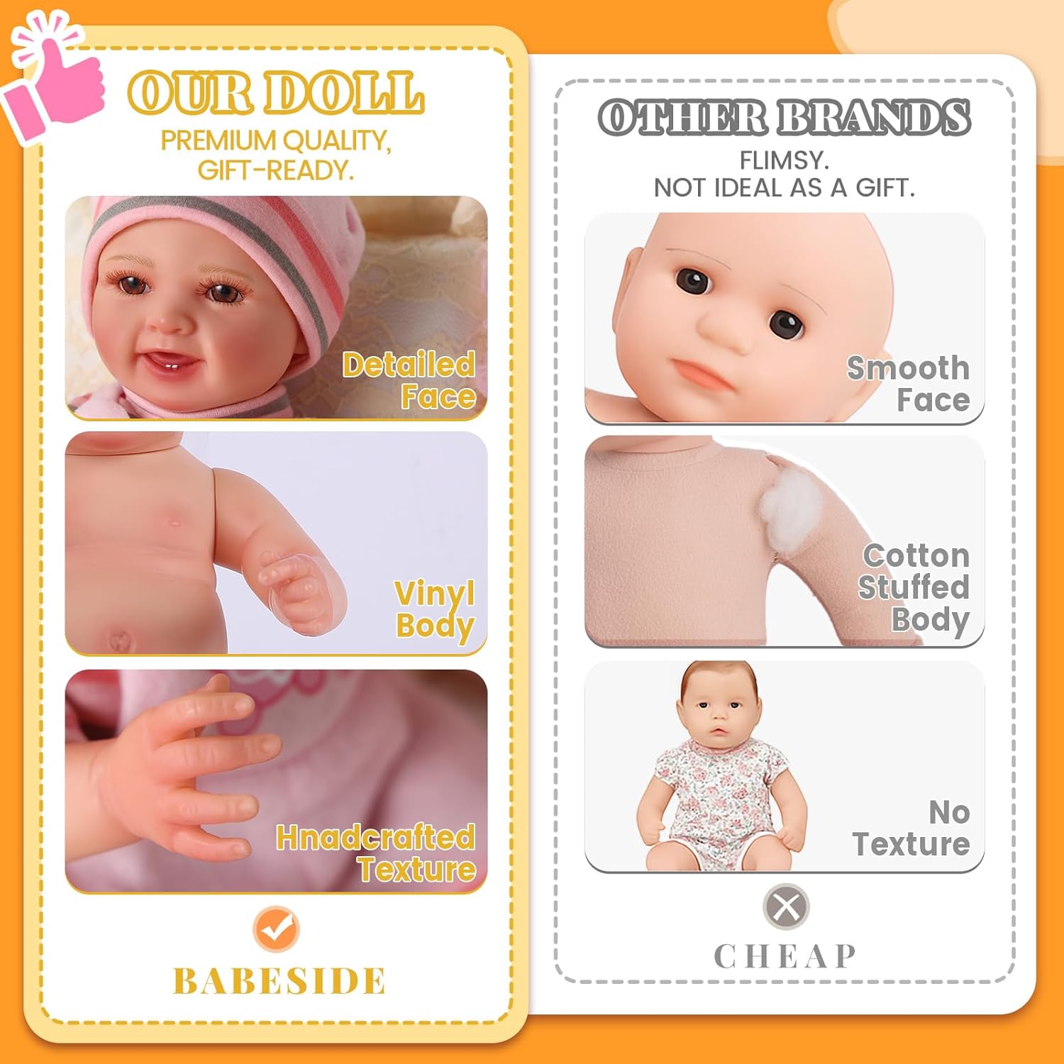 Irresistibly Cute Doll Mia: Here comes the small version of BABESIDE's super star-Mia.With its endearing smile and outfit, this realistic baby doll for toddler is guaranteed to capture your heart. Her head is made of premium vinyl materials, which is skin-friendly, ensuring hours of cuddly fun for your little one. Plus, its durable construction means it can withstand all the love and playtime your child can give.