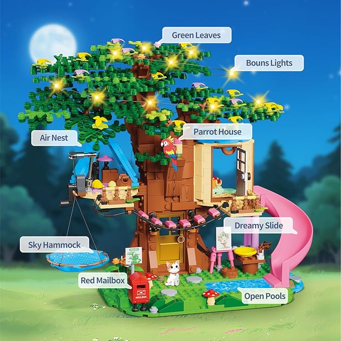 【Vibrant & Interactive Play】The girl forest tree house building blocks set features colorful blocks, a slide, a hammock swing, picnic table, and more, plus a built-in lighting component for a magical nighttime play experience. Encourage imaginative play with the detailed and vibrant design