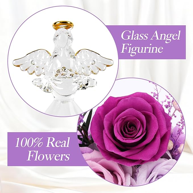 Preserved Rose Angel Gift for Her: Nestled inside a 7-inch height delicate glass angel figurine dome, this purple preserved rose gift stands as a timeless symbol of endless love and protection. The angel features gold accents on its halo and the edges of its wings, adding a touch of elegance. It is designed to surprise and delight, suitable for gifting as a birthday gift for her, Christmas gift for grandma, romantic anniversary gift for wife, or sweet Valentine's Day gift for girlfriend