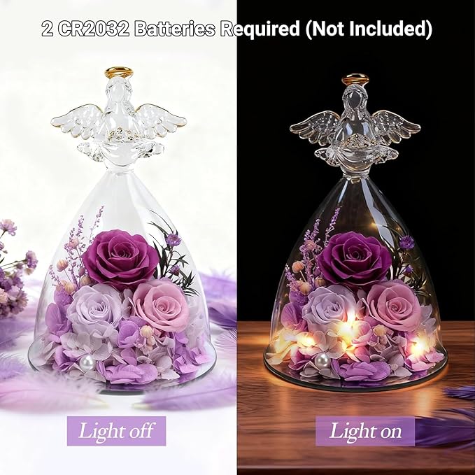 Mother's Day Angel Figurine with LED Lights: Expertly positioned at the ideal viewing angle inside the glass dome rose display, the stunning bloom glows beautifully under the built-in warm light. The gentle glow works wonders as a comforting nightlight gift for women, providing peaceful companionship through quiet evenings or sweet dreams. LED lights require 2 CR2032 batteries for power supply, and the packaging does not include batteries.