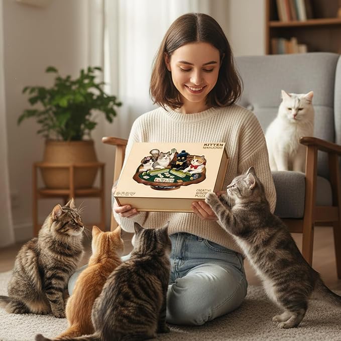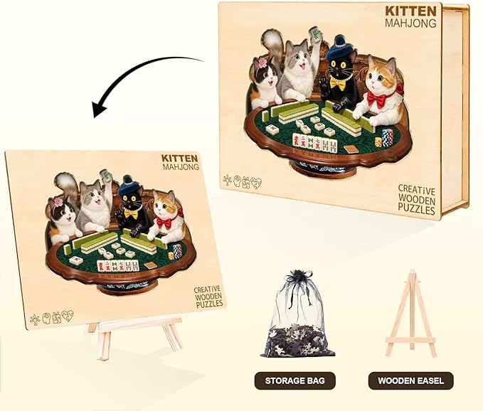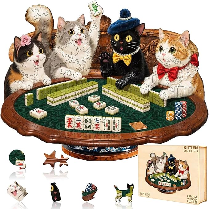 【UNIQUE CAT PUZZLE DESIGN】Escape into the whimsical world of anthropomorphic felines with this exquisite wooden jigsaw puzzle. Every unique animal shaped piece of this detailed, cartoon-style illustration celebrates the playful cats playing Mahjong, setting it apart from ordinary cat puzzles. This novelty, challenging adult puzzle is the perfect, relaxing gift for any cat lover, Mahjong player, or a tranquil treat for yourself, offering a stress-relief leisure activity with charming design.