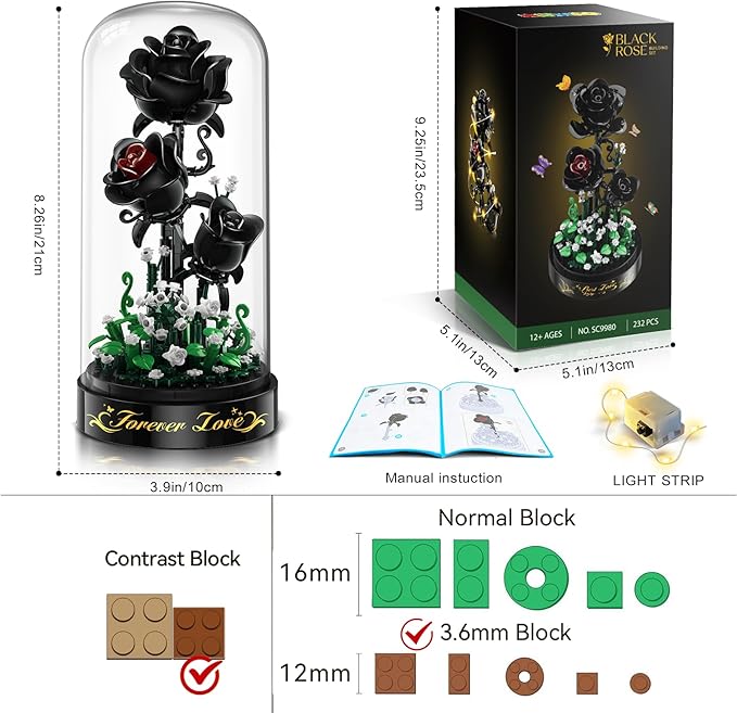 【Safe & Easy Assemble】This 232 pieces mini roses bouquet building set toy is made of high quality and environmentally friendly ABS plastic, suitable for ages 12 and up. The surface of the blocks is smooth, and the advanced processing technology ensures that your black rose bouquet is firmly connected, no deformation, no color fading, no burrs, no odor. Let you have a good experience in assembling this rose flower building block set.