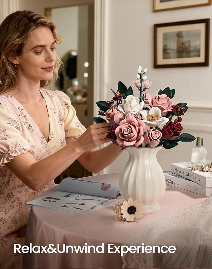 iATOM Pink Roses Flower Bouquet Building Set, Artificial Flowers Botanical Collection Kit for Adults Women & Men - Gift for Valentines Day, Home Room Office Shelf Centerpieces Decor - IA11022