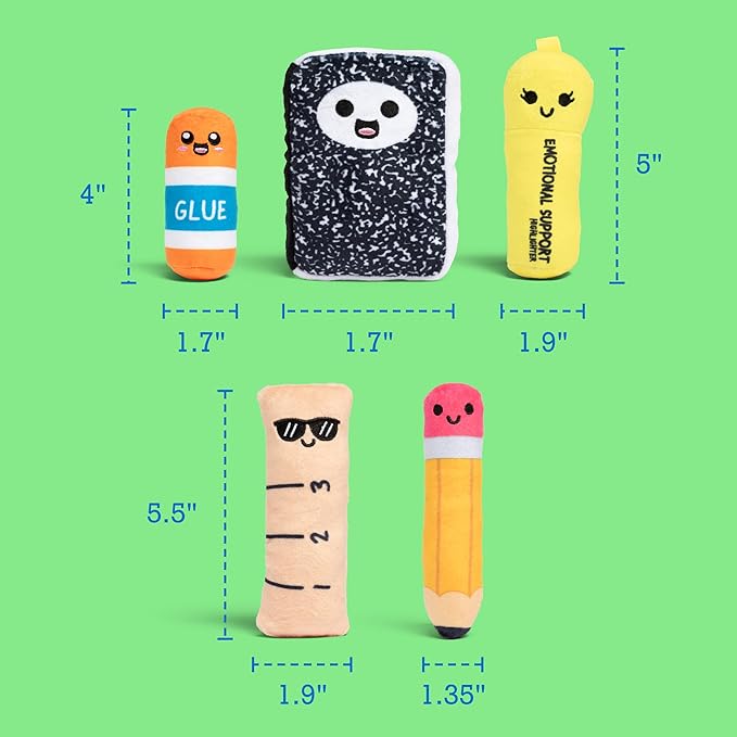 What’s Inside: Includes 1 plush basket and 5 school supply plushes including pencil, ruler, highlighter, glue stick, and notebook. Fun plush school supplies for kids and adults!