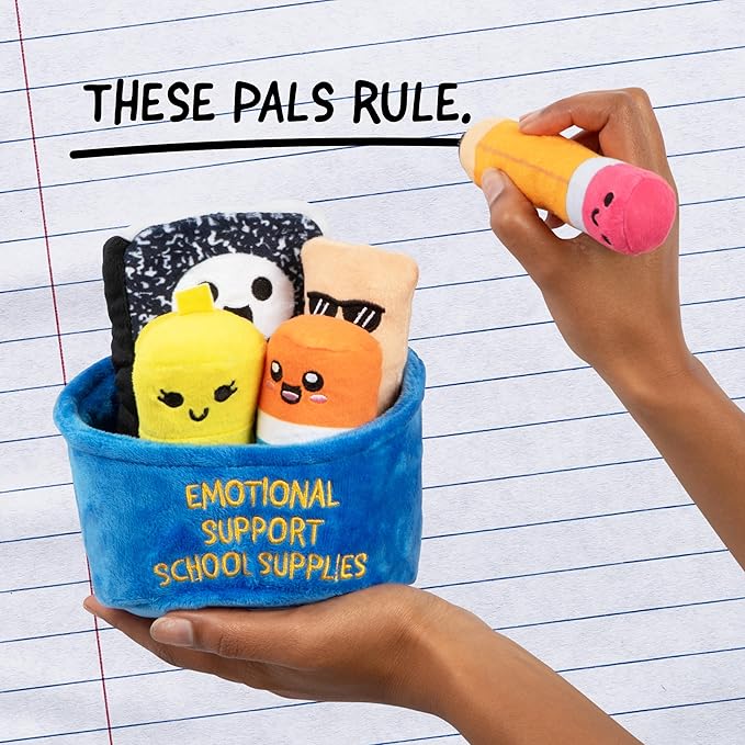 Study Buddies: Emotional Support School Supply plush are soft, squishy versions of your favorite back to school supplies. Perfect plush toys for cozy comfort during homework, studying, or on-the-go.