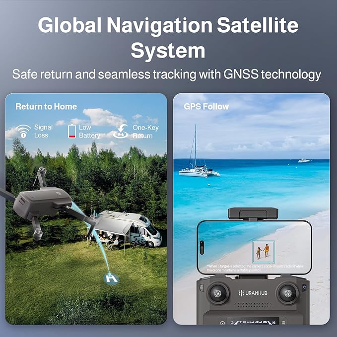 ๐๐๐๐ ๐๐ฒ๐ฌ๐ญ๐๐ฆ โ ๐๐ซ๐๐๐ข๐ฌ๐ ๐๐จ๐ฌ๐ข๐ญ๐ข๐จ๐ง๐ข๐ง๐ : With GPS and Optical Flow Positioning System, the UranHub 4k drone provides stable and precise hovering. When the battery is low, the signal is lost, or you press the One-Key Return, your drone will automatically fly back. The GPS Follow Mode intelligently tracks your movements, capturing stunning, dynamic footage with hands-free and effortless control